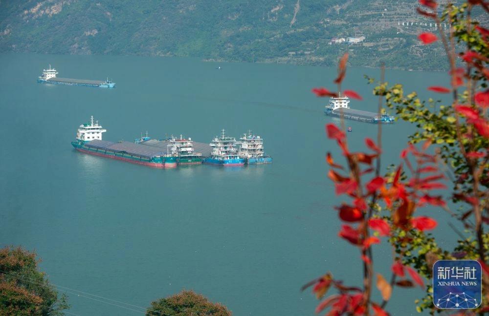 11月16日,船舶行驶在湖北省宜昌市秭归县西陵峡水域(无人机照片)。新华社发(王罡摄)