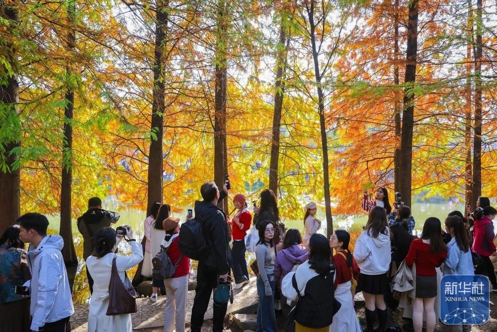 11月16日,游客在江苏南京明孝陵景区燕雀湖畔赏景游玩。新华社发(苏阳摄)