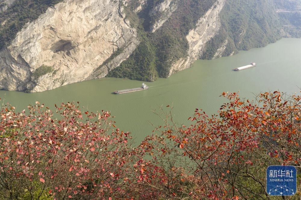 11月16日,船舶行驶在湖北省宜昌市秭归县西陵峡水域(无人机照片)。新华社发(雷勇摄)