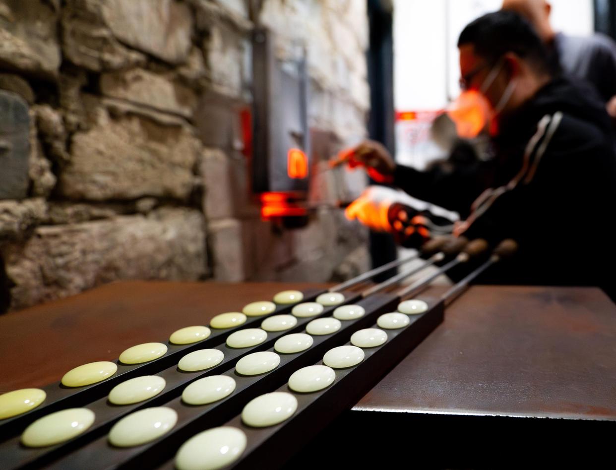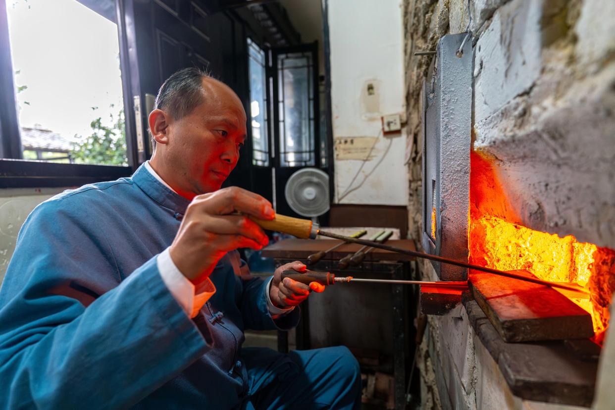 走进位于保山市隆阳区金鸡乡的永子文化园,上千度的窑炉昼夜不息。永子第十二代传人、国家级非遗传承人李国伟坐于炉前,目光如炬。他右手持特制滴棒,从容蘸裹熔化的玉料,将其轻巧滴沥在左手所持的厚铁板上。