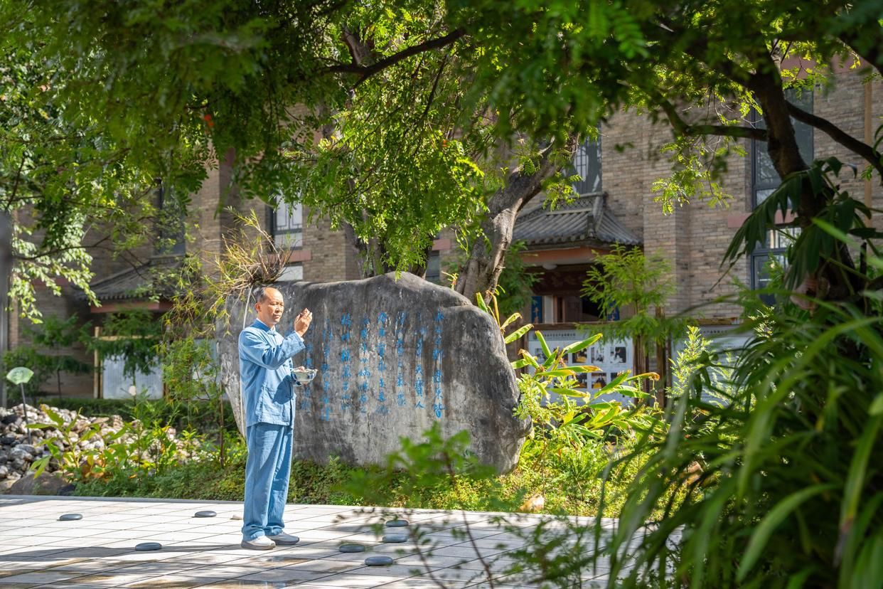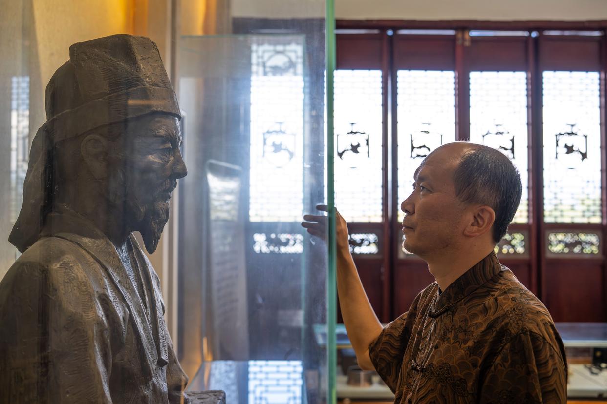 11月20日,在保山市永子棋院,李国伟注视李德章雕像。