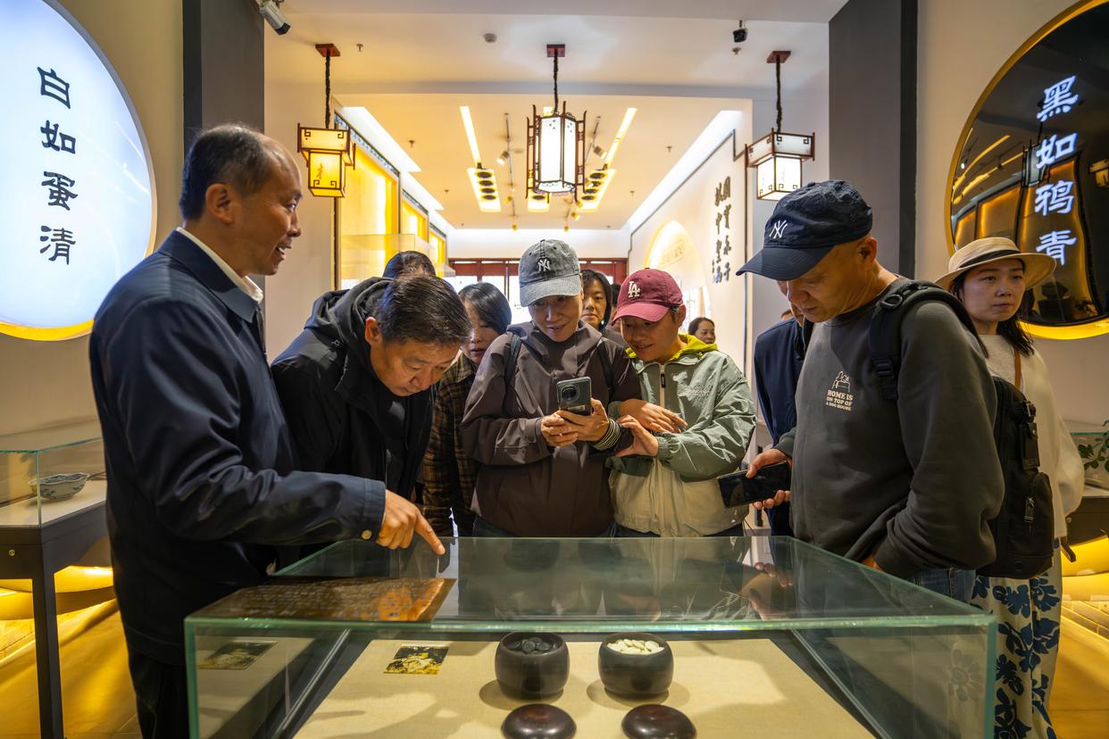 11月19日,李国伟(左一)在保山市永子棋院内的永子博物馆向游客介绍一副古代永子。