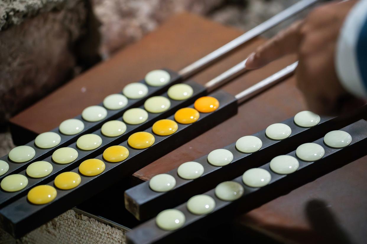 在一点一收间,一枚枚莹润细腻的永子从火红的液态逐渐凝固成扁圆的固态,在铁板上整齐排列。“这看似机械、快速的动作,至少需要六七年的苦练才能达到心手合一,”李国伟说,“因为滴制永子没有模具,大小薄厚全凭经验和手感。”40多度的室温环境下,火光照映在李国伟脸上,汗水浸湿衣衫,他却气定神闲,一气呵成,几分钟就滴制出一盘大小、薄厚统一的棋子。
