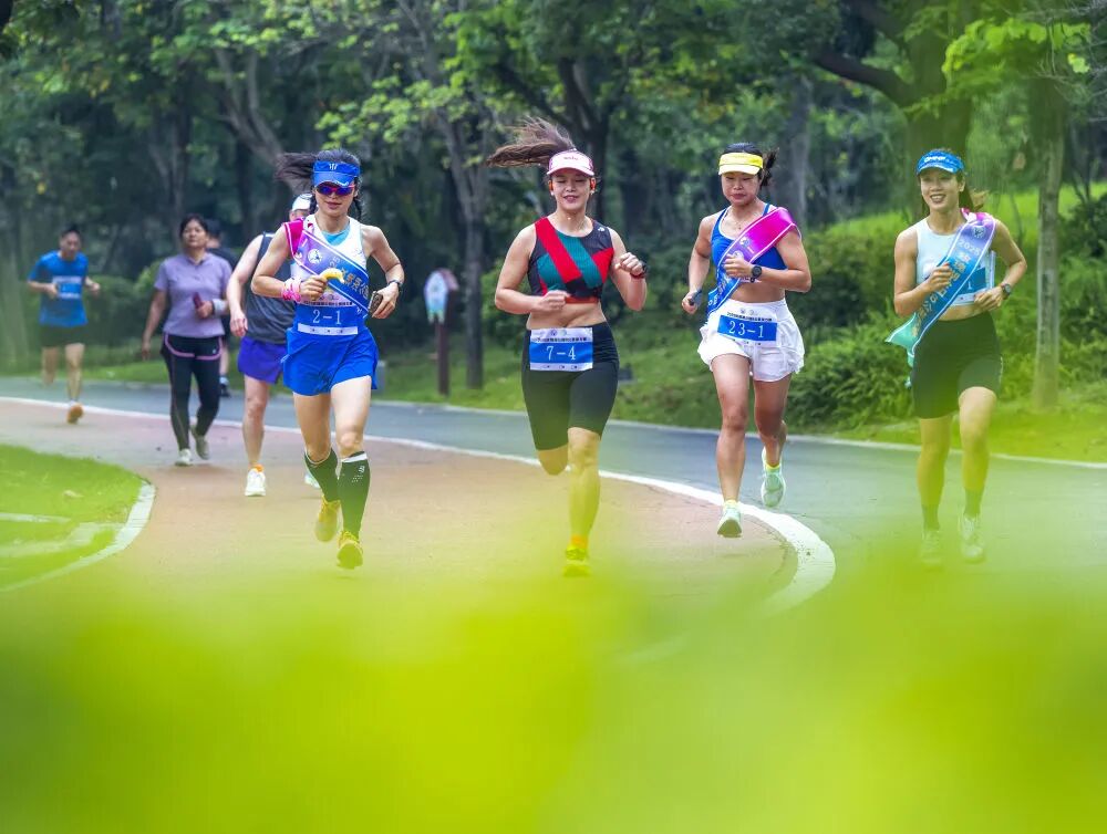 跑步爱好者在广西梧州市玫瑰湖公园参加跑步接力赛。新华社发(何华文摄)