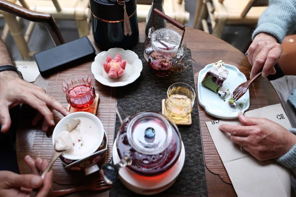 客人在享用茶和茶点。新华社记者 高静 摄