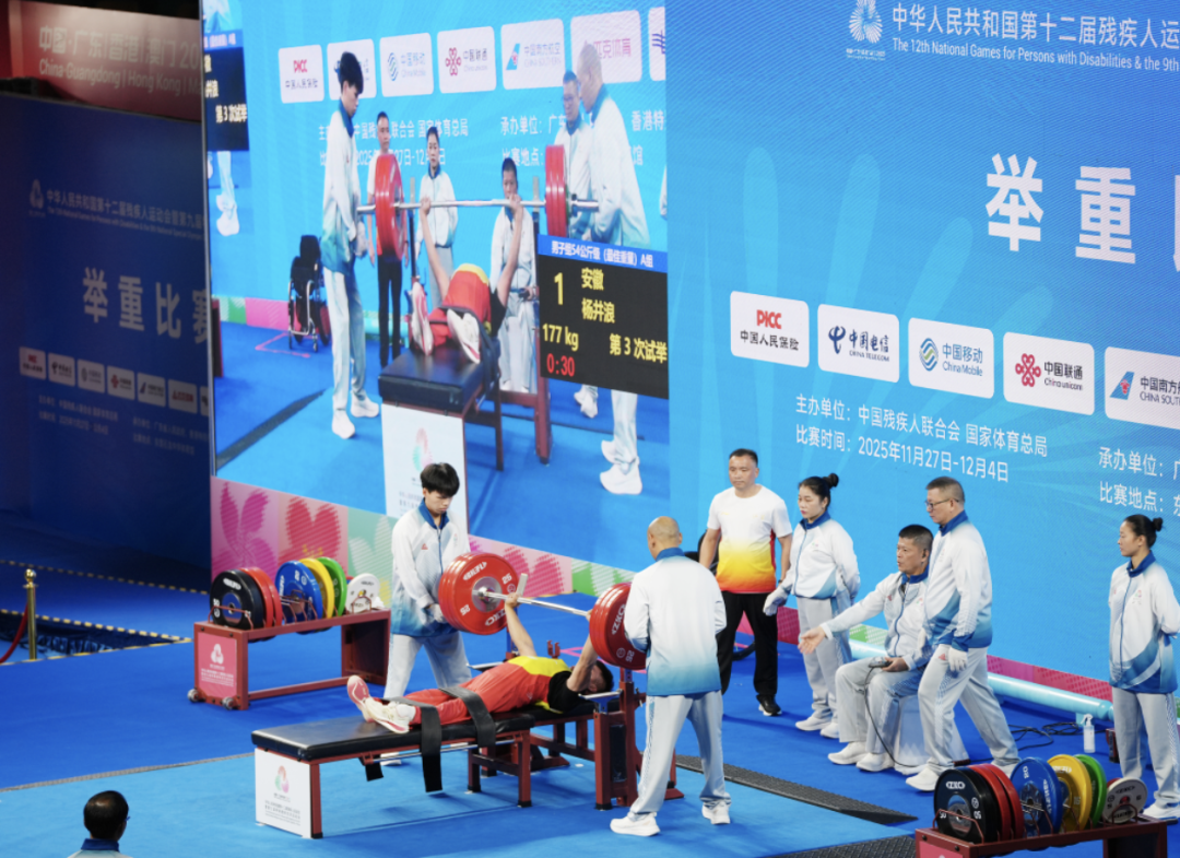 11月30日,全国第十二届残疾人运动会暨第九届特殊奥林匹克运动会举重比赛在广东东莞拉开帷幕,134名举重运动员展开角逐。