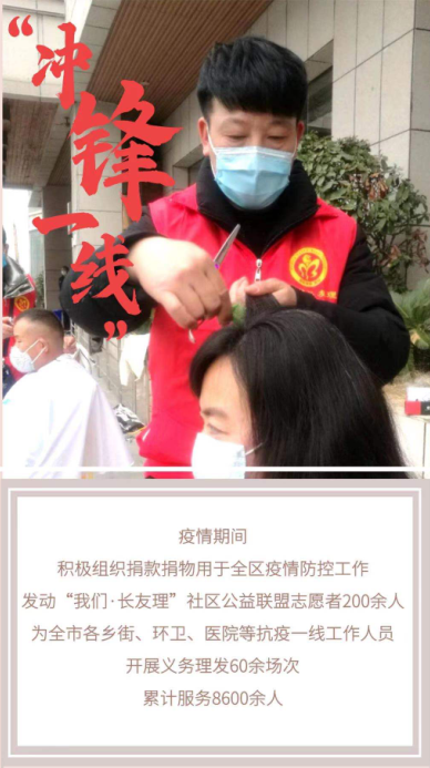 2013年6月,蚌埠市美容美发行业协会成立,多年来,会长刘景铸带领协会成员为敬老院、福利院老人和儿童等免费理发数千人,并捐款捐物数十万元为社会公益事业奉献爱心。2018年,带动成立“我们·长友理”社区公益联盟,为辖区行动不便人员长期上门免费义剪,服务范围逐步向全市覆盖。疫情期间,积极组织捐款捐物用于全区疫情防控工作,发动“我们长友理”社区公益联盟志愿者200余人,为全市各乡街、环卫、医院等抗疫一线工作人员开展义务理发60余场次,累计服务8600余人。