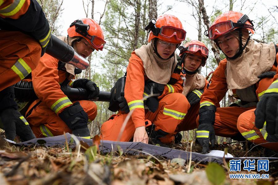奇乾中队的消防队员在营地内训练(5月15日摄)。新华社记者 刘磊 摄
