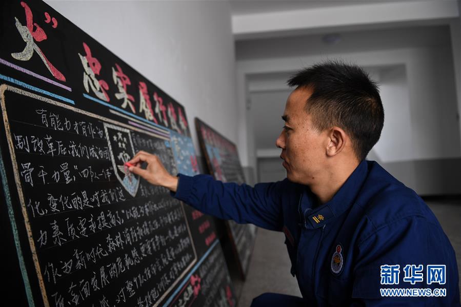 在奇乾中队的营地,来自四川大凉山的彝族小伙儿布约小兵用粉笔修饰黑板报(5月18日摄)。新华社记者 刘磊 摄