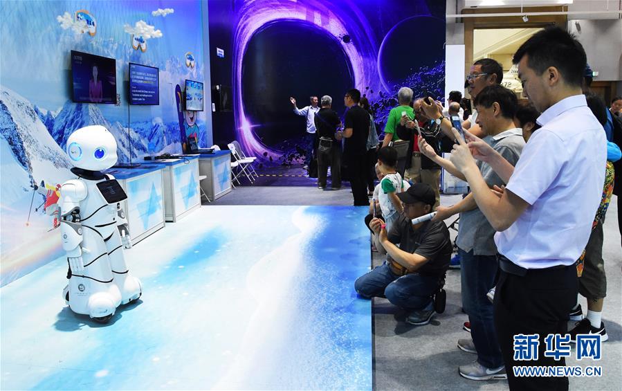 在2019年全国科技活动周北京主场活动中,观众参观类人型商用服务机器人表演(2019年5月21日摄)。 新华社发(任超 摄)
