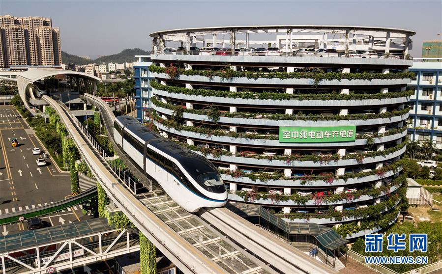 在位于深圳的比亚迪总部,“云轨”列车在运行调试中(2018年11月30日无人机拍摄)。新华社记者 毛思倩 摄