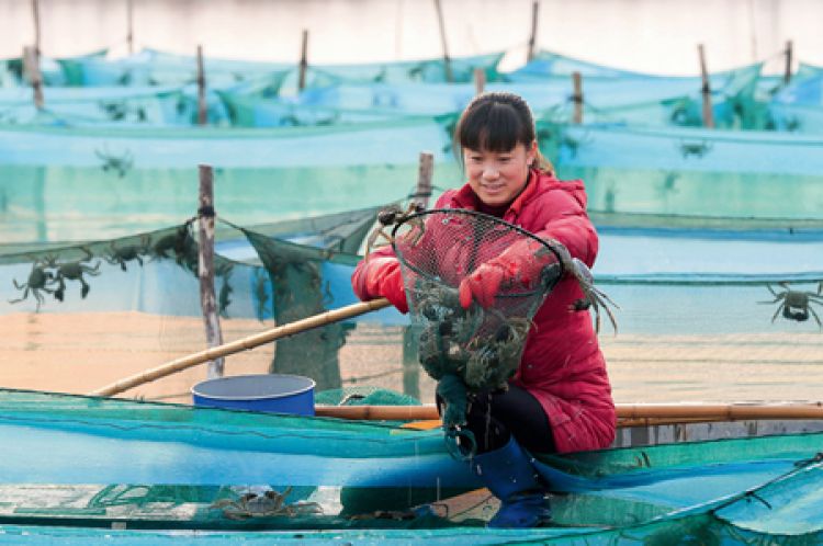 1 月1 日,江苏省盱眙县淮河镇周湖村,村民在网箱内捕捞大闸蟹 周海军摄/ 本刊