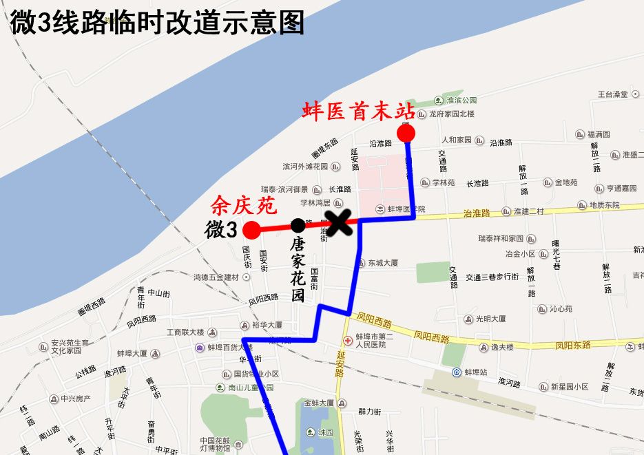 因治淮路西段(国治街至延安路)封闭施工,2019年7月20日起,公交微3线路来回双向改道为:客运南站—原线路—延安路—治淮路—国强路—蚌医首末站。