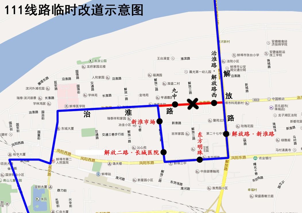 因治淮路(解放三路至解放路)封闭施工,2019年7月20日起,公交111路来回双向改道为:机电技师学院—原线路—治淮路—解放二路—凤阳路—解放路—原线路—客运北站。