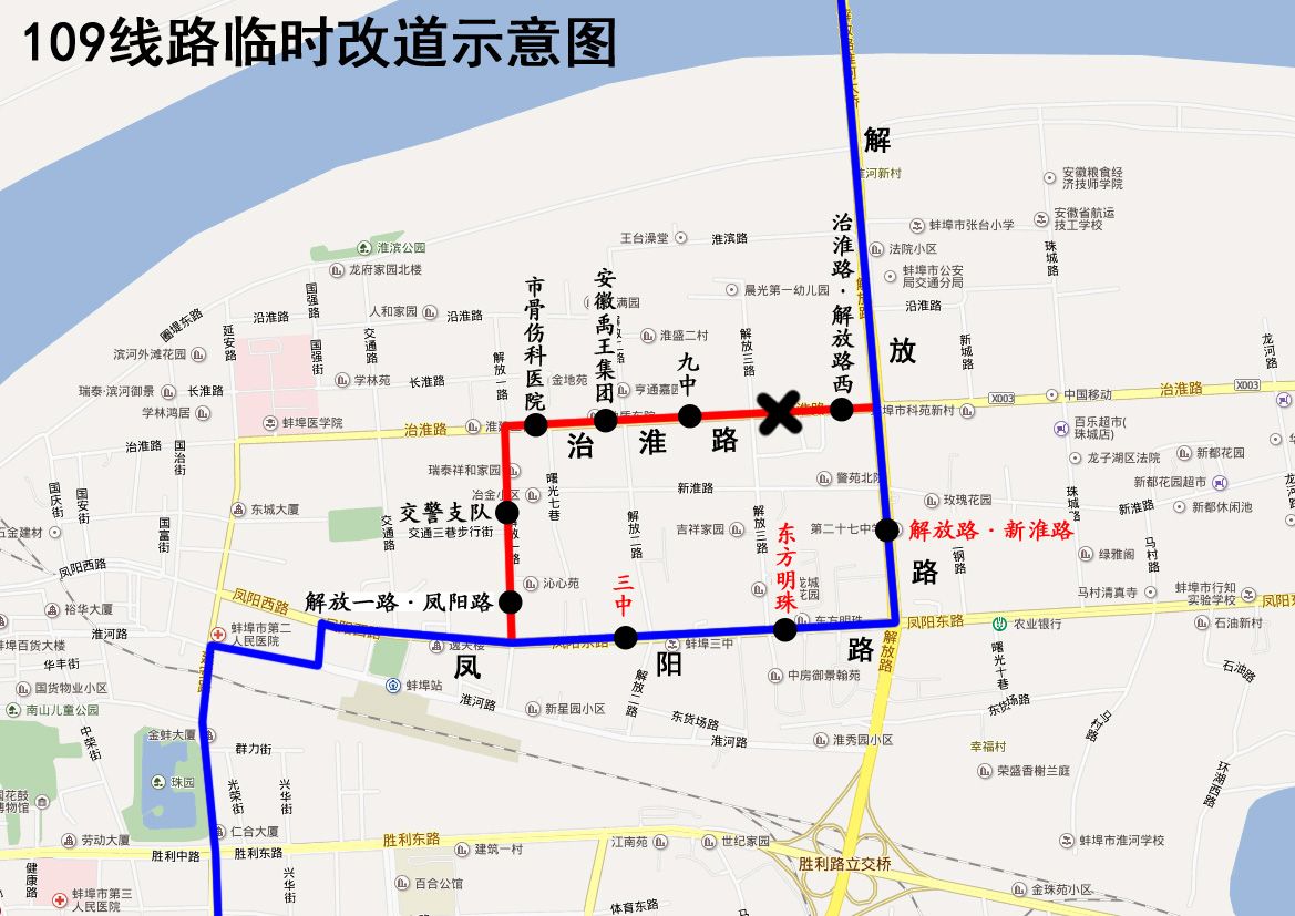 因治淮路(解放三路至解放路)封闭施工,2019年7月20日起,公交109路来回双向改道为:客运南站—原线路—凤阳路—解放路—原线路—客运北站。