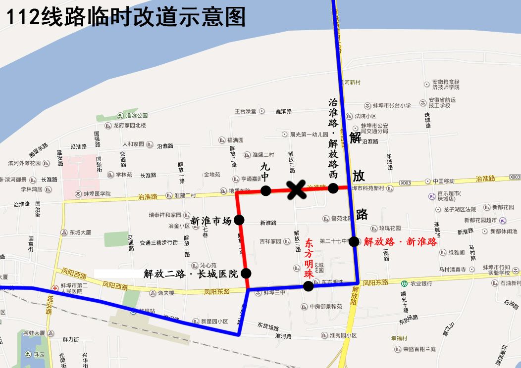 改道期间公交车将取消停靠“解放二路·长城医院”、“新淮市场”、“九中”、“治淮路·解放路(西)”站。临时停靠“东方明珠”、“解放路·新淮路”站,封闭施工结束后恢复原线。