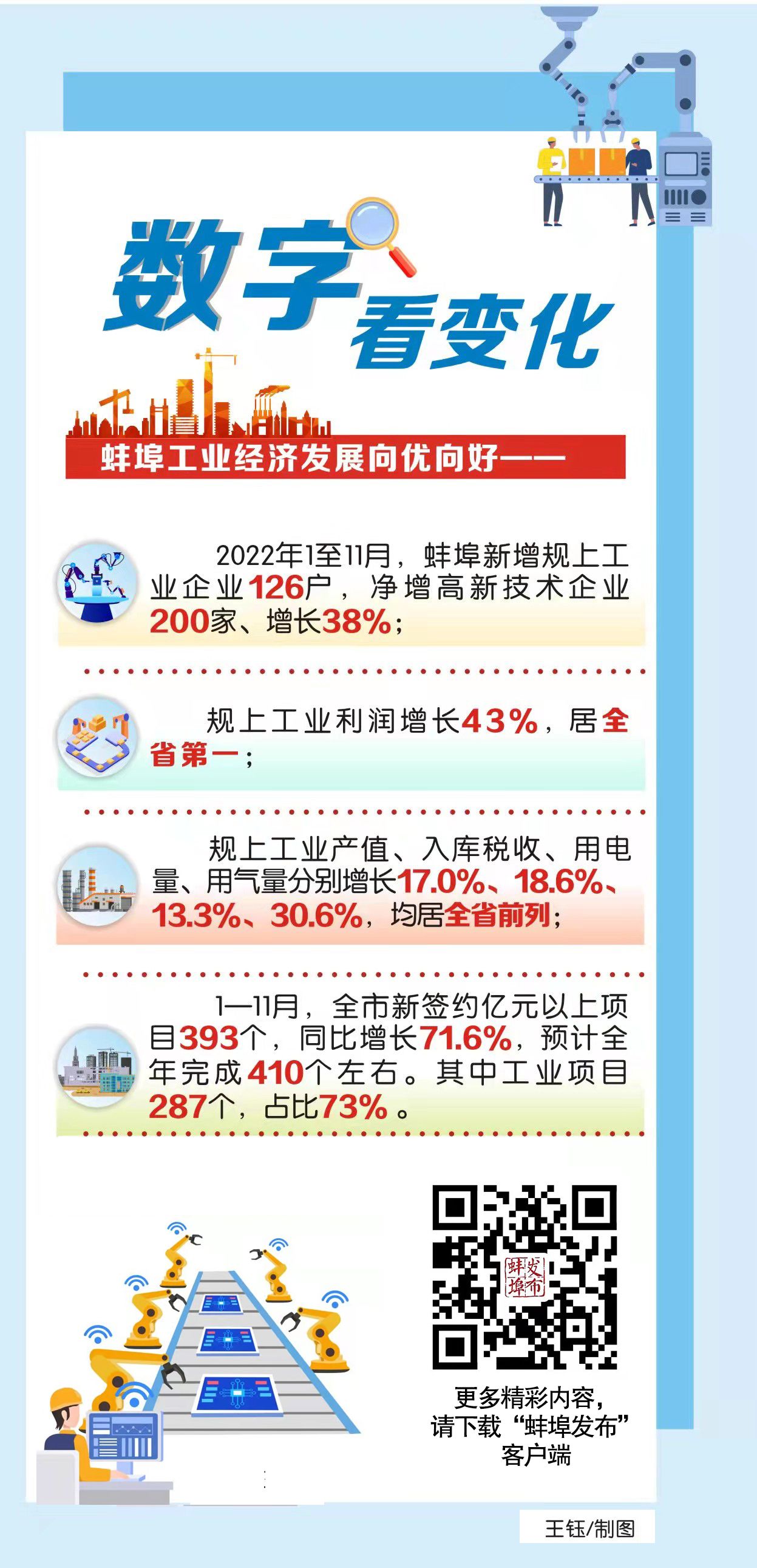 2022年1至11月,蚌埠新增规上工业企业126户,净增高新技术企业200家、增长38%;
