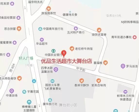 根据百度地图显示 优品生活超市大舞台店位于中平街附近