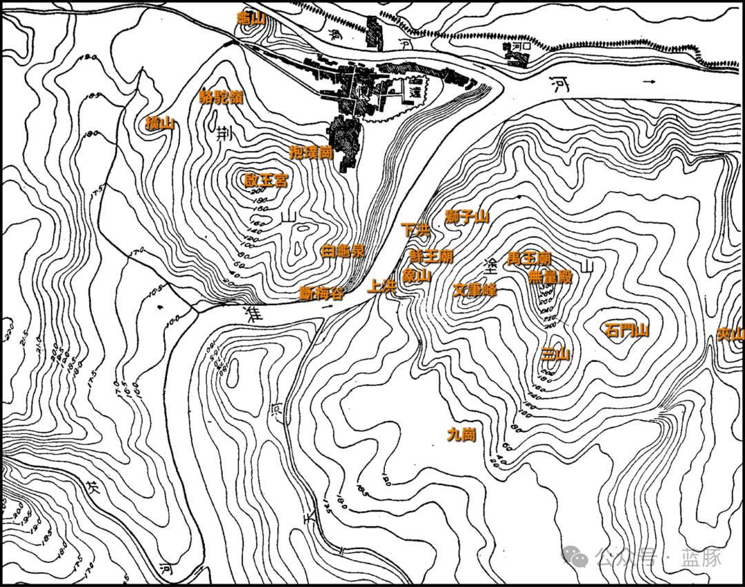 西北麓起小山,为九龙坟,一坡直走淮心,长可一里,俗名李家嘴。其西南麓伏而起为三山,亦谓之九冈,起伏重叠,滨于天河,其山之引而东者,曰石门山,两山如门。