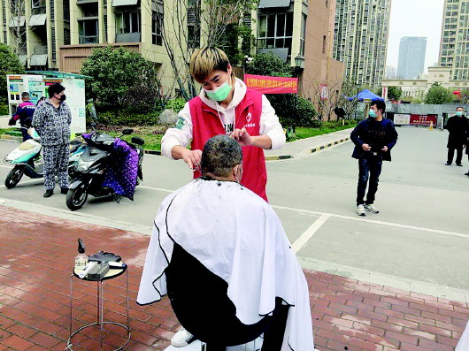 27日上午,理发师石群带领他的团队来到禹会区喜迎门社区卫生服务中心,为疫情防控医护人员免费理发,解决他们的“头等大事”。记者 张婷婷 通讯员 刘芳 摄