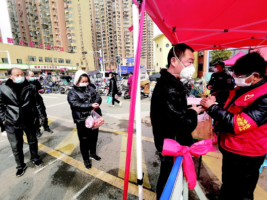 27日上午,淮河路西段上,市民经过测量体温后才可以进入市场买菜。