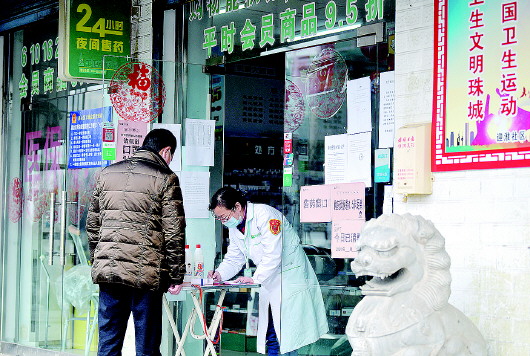 27日上午,胜利西路一家药店外,顾客登记买药。