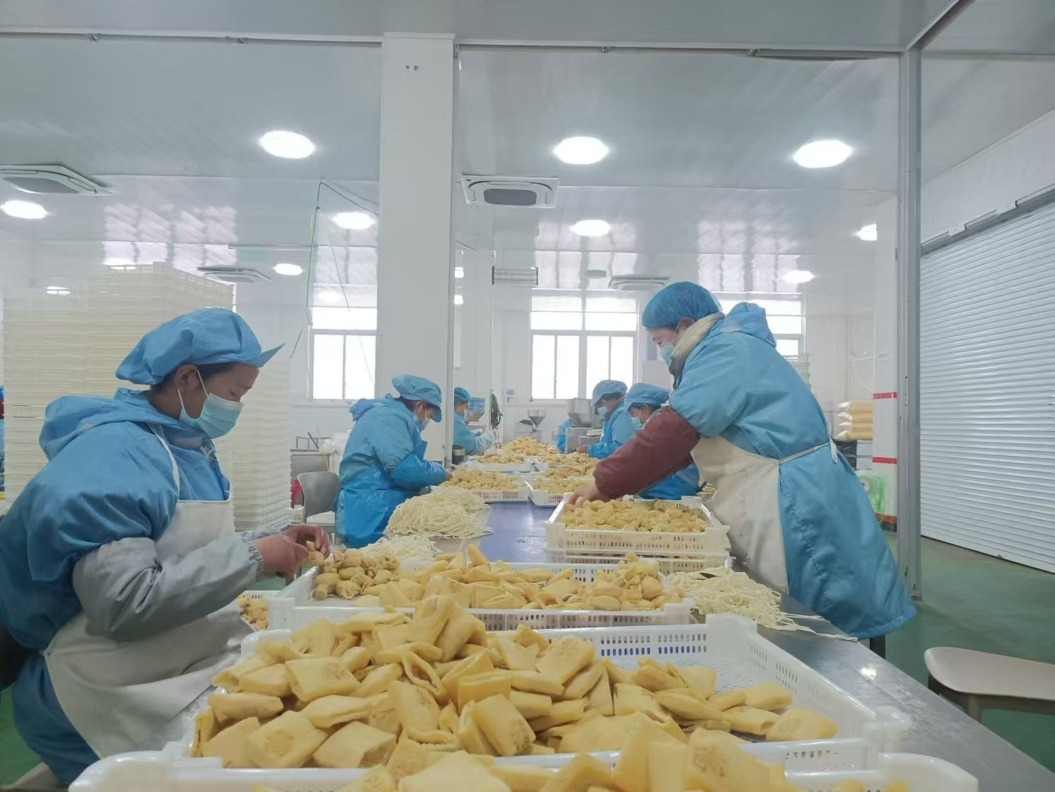 大新镇郭府村村民在村企合作的明侯故里食品有限责任公司加工豆制品