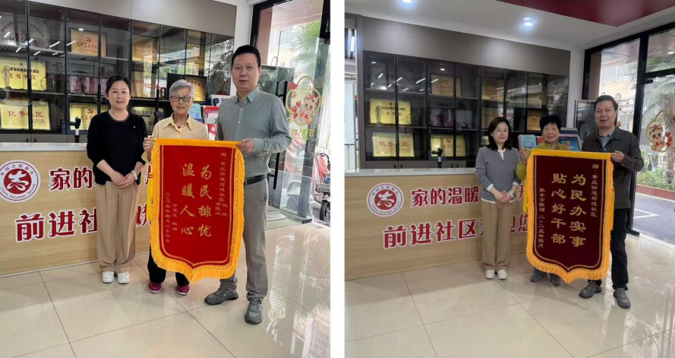 前进社区胜利中路156号小区2楼、3楼居民代表将两面印有“为民排忧 温暖人心”“为民办实事 贴心好干部”的锦旗送到社区党群服务中心,感谢社区、街道城管科及村居法律顾问历时两个月的耐心调解,成功化解因卫生间马桶下水管道堵塞引发的邻里矛盾。