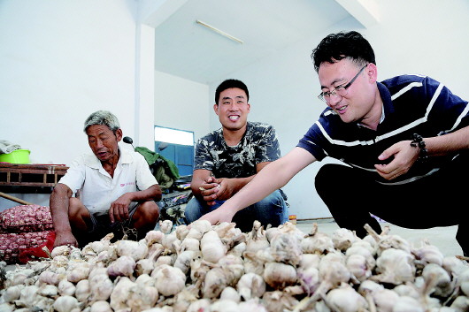 贫困户丁彩君和上门收购大蒜的黄计亮(右)交谈大蒜价格。 李斌 摄