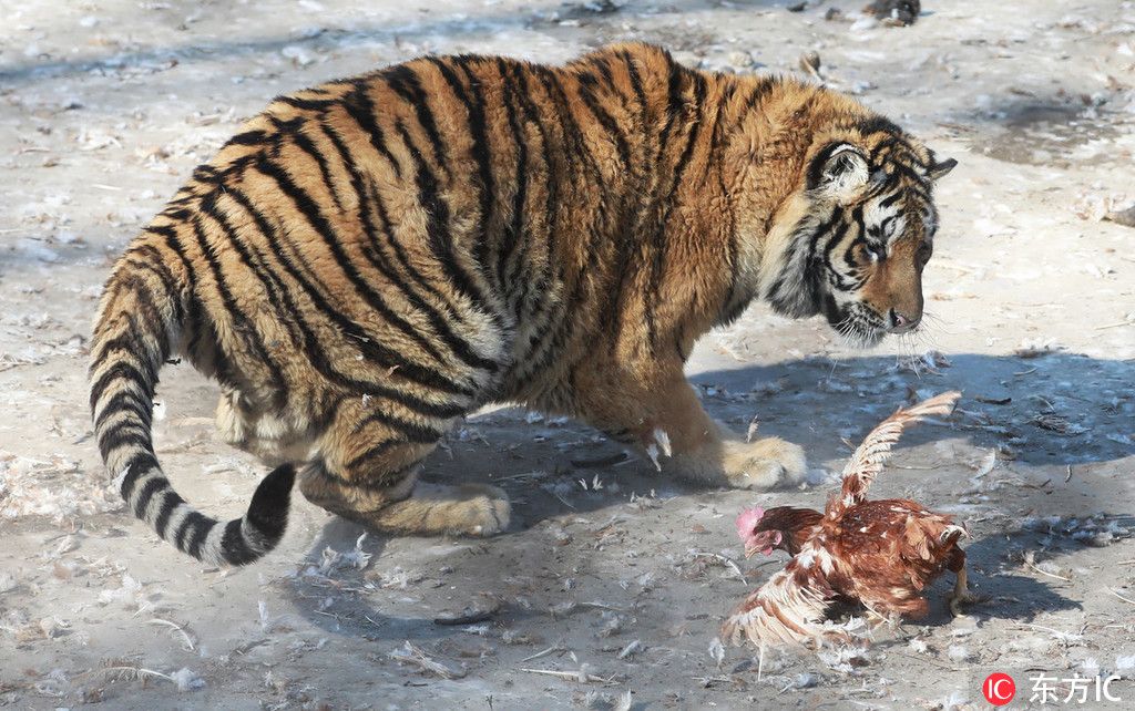 哈尔滨东北虎林园里老虎过年过的身材圆滚滚的,走路懒洋洋,抓鸡都费劲,虎威尽失。园区观光车司机说:“过年天天吃肉,别说老虎,人能受得了吗?老虎胖成这样都是过年过的”。 据悉,东北虎林园为世界最大的东北虎人工饲养繁育基地,园内共有上千只东北虎,每年都会吸引许多来自世界各地的游客。据了解,东北虎主要分布在中国东北和俄罗斯西伯利亚的寒冷地带,是国际野生动物基金会所列“世界十大濒危动物”之一。/东方IC