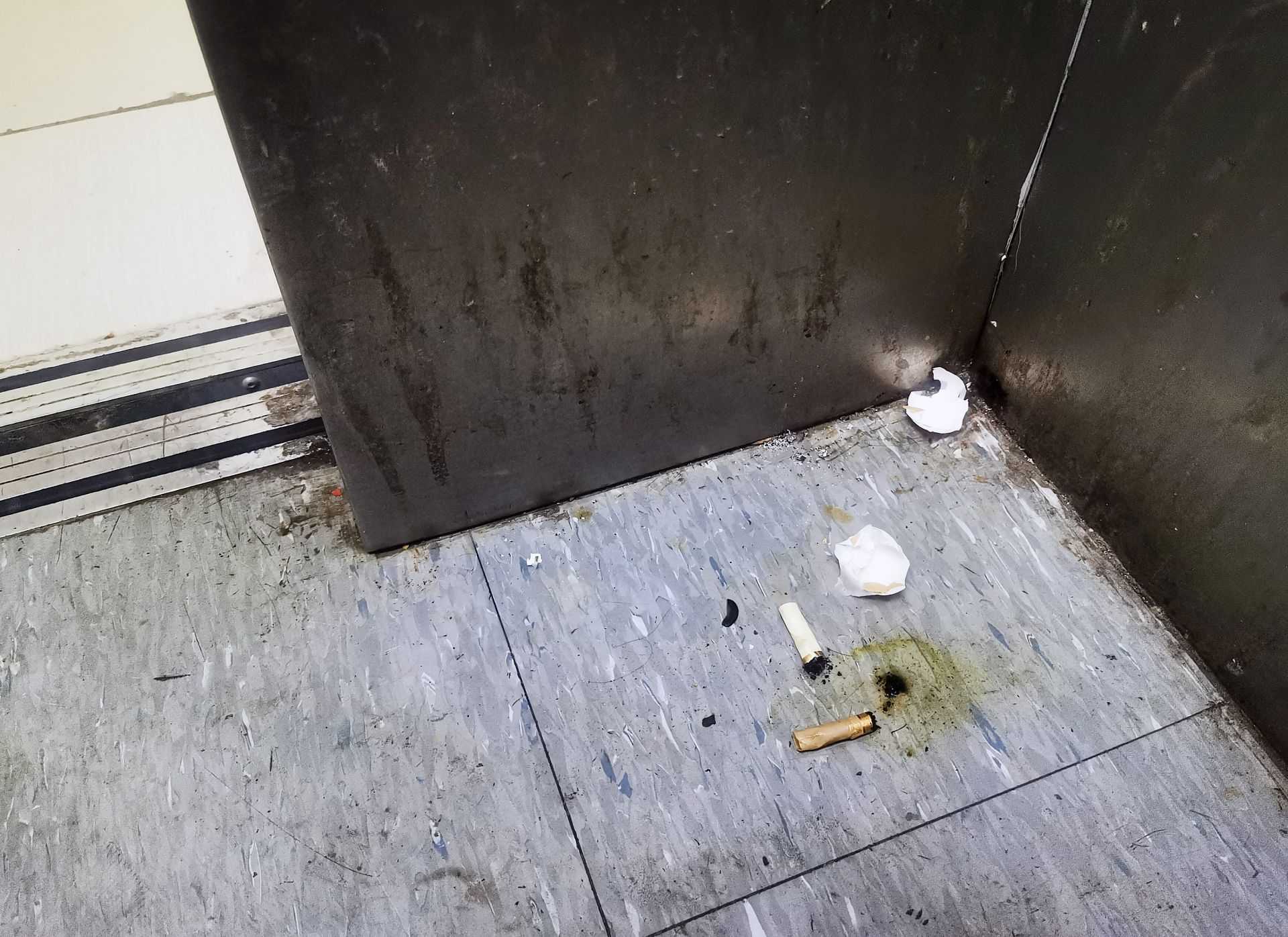 6月23日,航华嘉苑小区3号楼一单元,其电梯轿厢壁上有生活污渍,脚下还有蛋壳、熄灭不久的烟头。