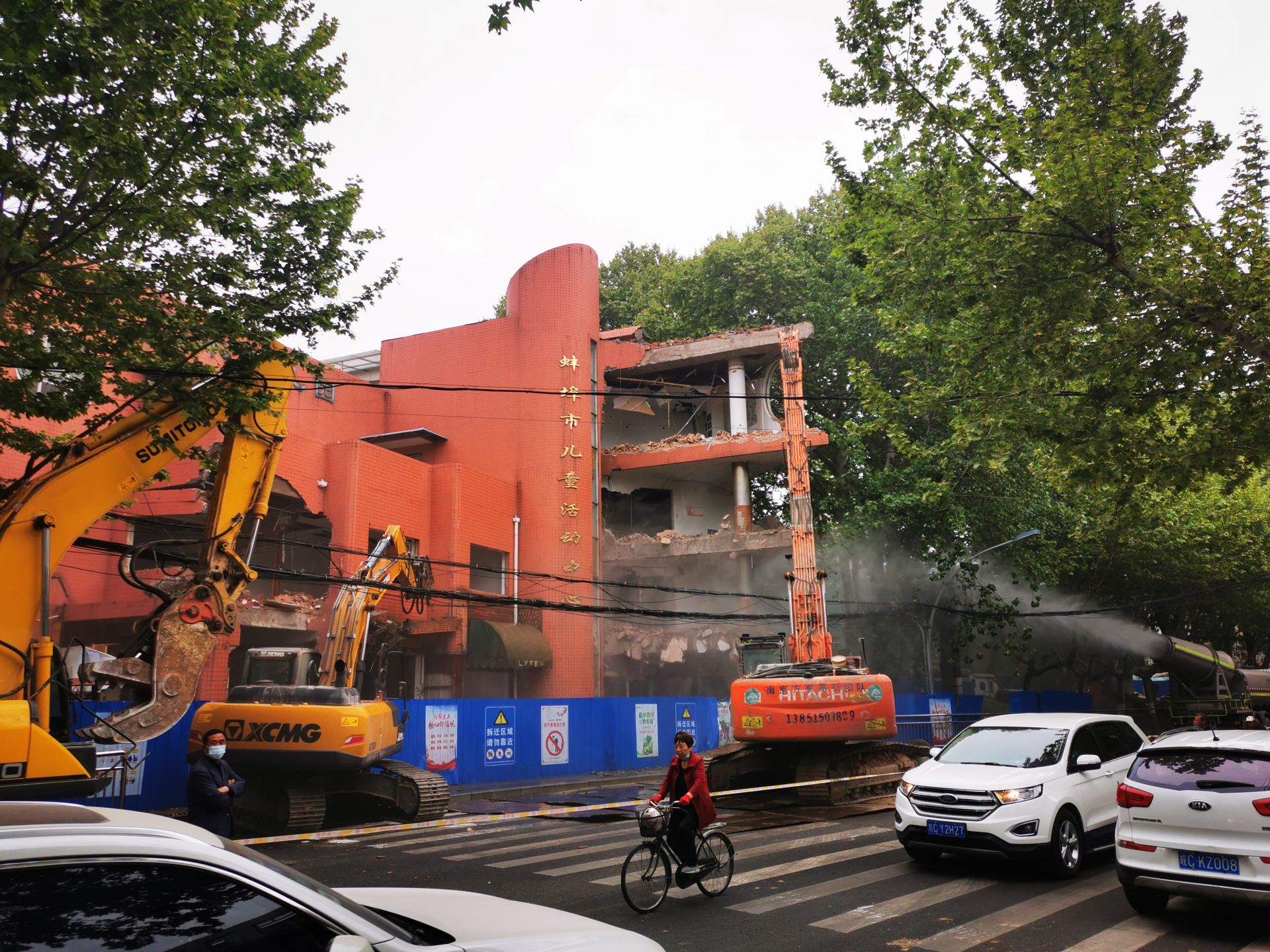 蚌埠新闻网讯(记者 陈昂 文/图)4月20日早上,随着中荣街上几台挖掘机轰隆隆的运作声,有着30年余历史的原蚌埠市儿童活动中心开始拆除,作为南山儿童公园改造的一部分,这座建筑拆除后将不再盖房子,而是成为南山公园通往津浦大塘公园的一条中轴线。