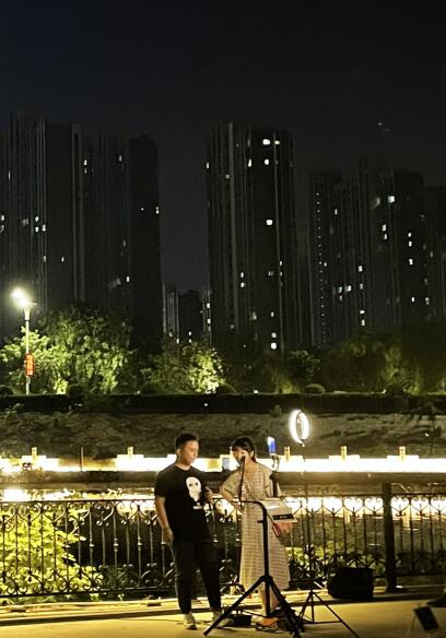 在此起彼伏的音乐声中,记者继续前行。不远处,两名年轻人在一片空地上,面前摆着直播架、补光灯,不时和直播间里的观众互动着。不一会儿,清新的女声从音响中传出,不过很快就埋没在附近更为高昂的音乐声中。