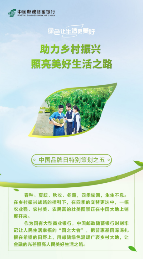 5月10日是第六个“中国品牌日”。邮储银行+推出“绿色让生活更美好”系列策划,多角度、多维度、多形式阐释“绿色让生活更美好”的品牌内涵,展现邮储银行为了人民美好生活的不懈努力。本期推出《助力乡村振兴 照亮美好生活之路》,一起感受邮储银行积极发挥自身禀赋优势,以金融力量助力绘就乡村振兴壮美图景,让金融的光芒照亮人民美好生活之路。