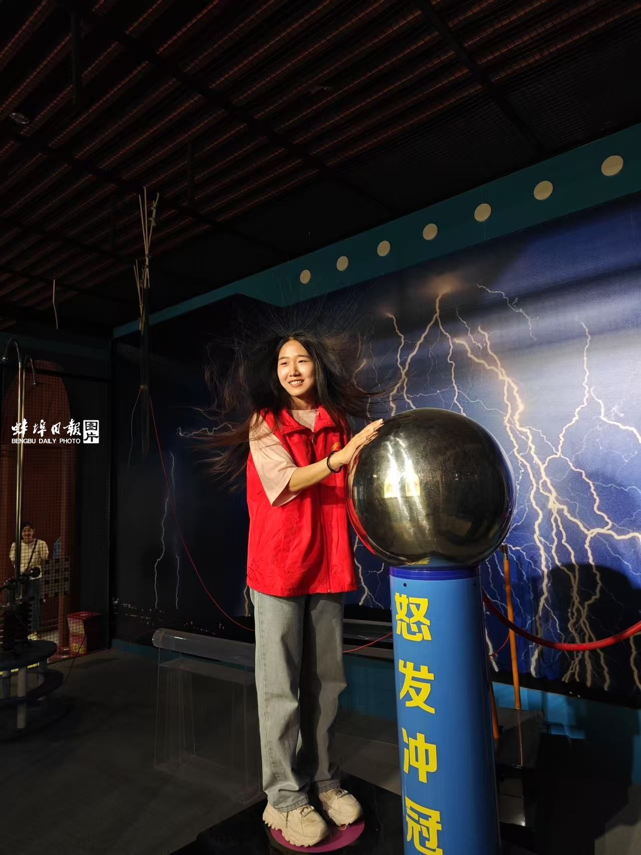 近日,蚌埠市科技馆内,一群孩子围绕着一个巨大的金属球,兴奋地体验着静电的神奇效果。身穿红色志愿者背心的王静慧,正耐心地向孩子们解释静电的原理,她的微笑和热情感染了在场的每一个人。
