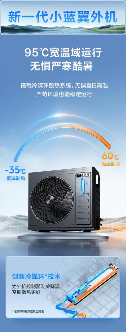 面对极端天气条件,传统中央空调往往力不从心,出现“冬天开不了、夏天不制冷”的问题。小蓝翼天花机新一代外机支持-35℃~60℃的超宽温域运行,搭配冷媒环散热系统,即便在北方零下35℃的严寒或南方60℃的高温暴晒下,也能稳定制冷制热,确保室内环境的舒适度。值得关注的是,创新冷媒环技术特指5匹机型搭载。另外,全直流变频系统的应用,更是让空调在极端环境下依旧动力强劲、运行高效,适配全国不同地域的气候特点。
