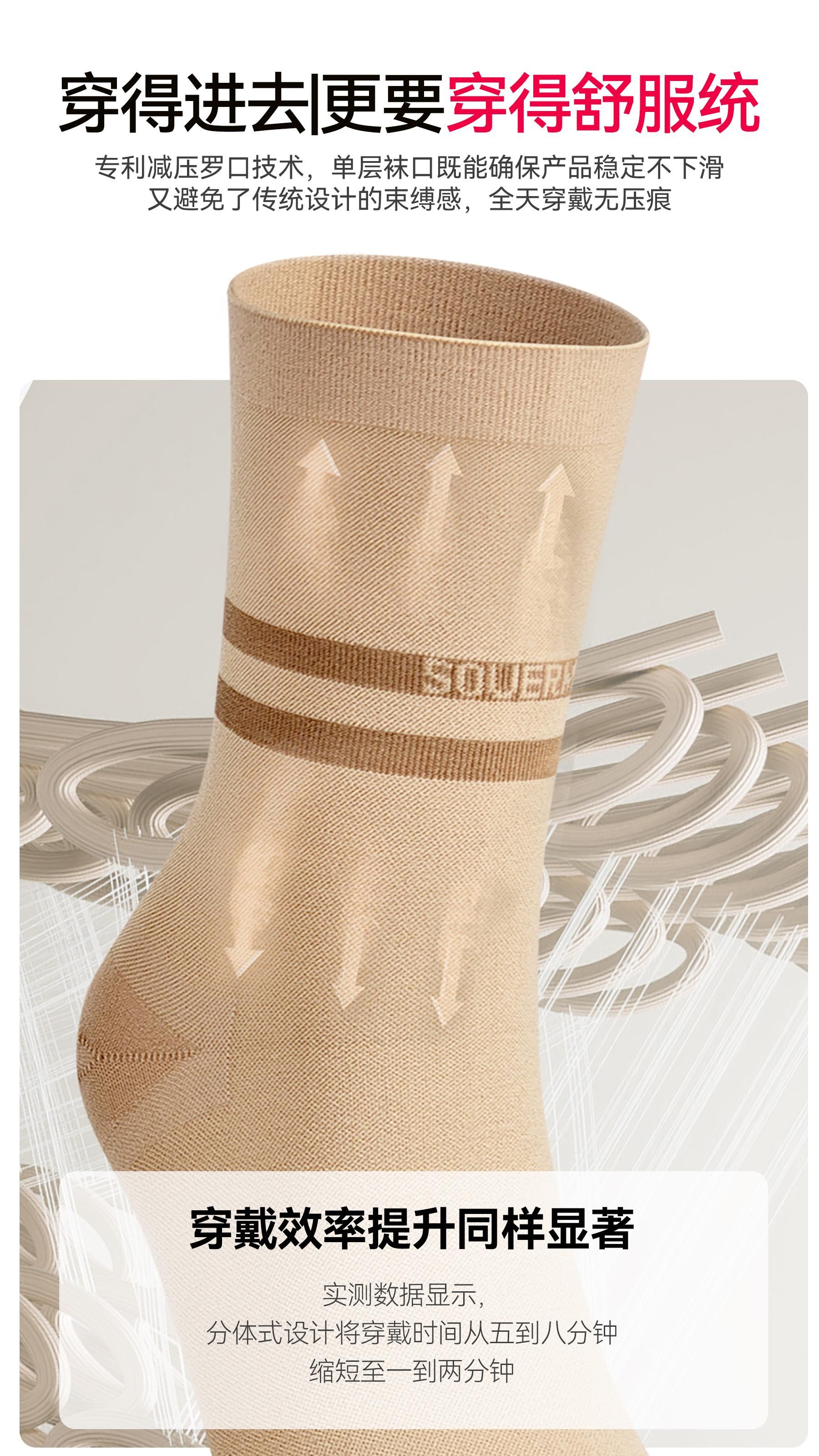 但传统一体式医用弹力袜的穿戴体验却让众多患者望而却步,由于需要提供足够的压力支撑,这类产品往往紧实厚重,普通人穿戴一次需要五到八分钟,对于行动不便的老年患者更是一项艰巨挑战。此外,袜子脚尖部位磨损后整双报废、款式单一难以适配日常穿搭等问题,也让许多患者在坚持治疗和生活品质之间左右为难。