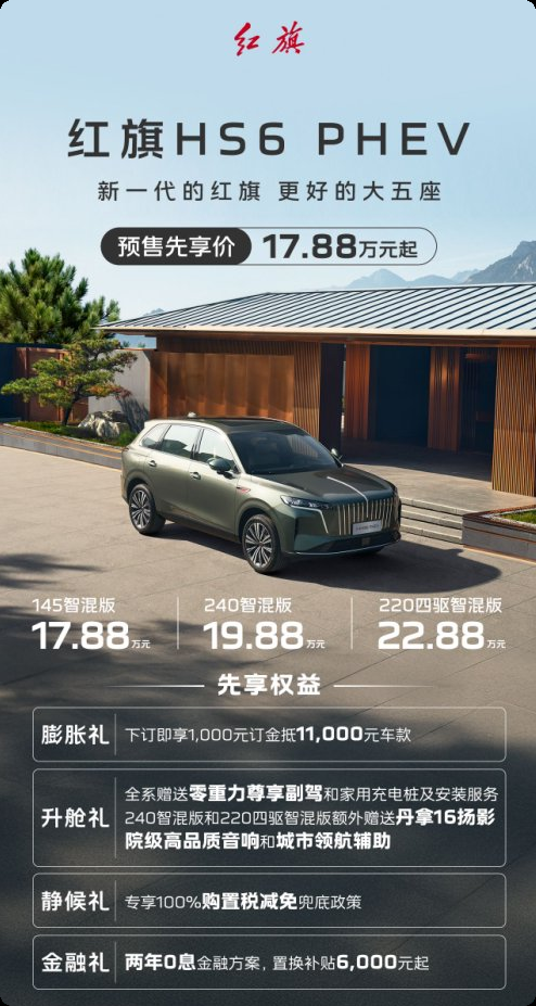 此次红旗HS6推出极具竞争力的预售方案,预售先享价17.88万元起,涵盖三大版本:145智混版17.88万元、240智混版19.88万元、220四驱智混版22.88万元。同时叠加多重诚意好礼,进一步降低家庭购车门槛: