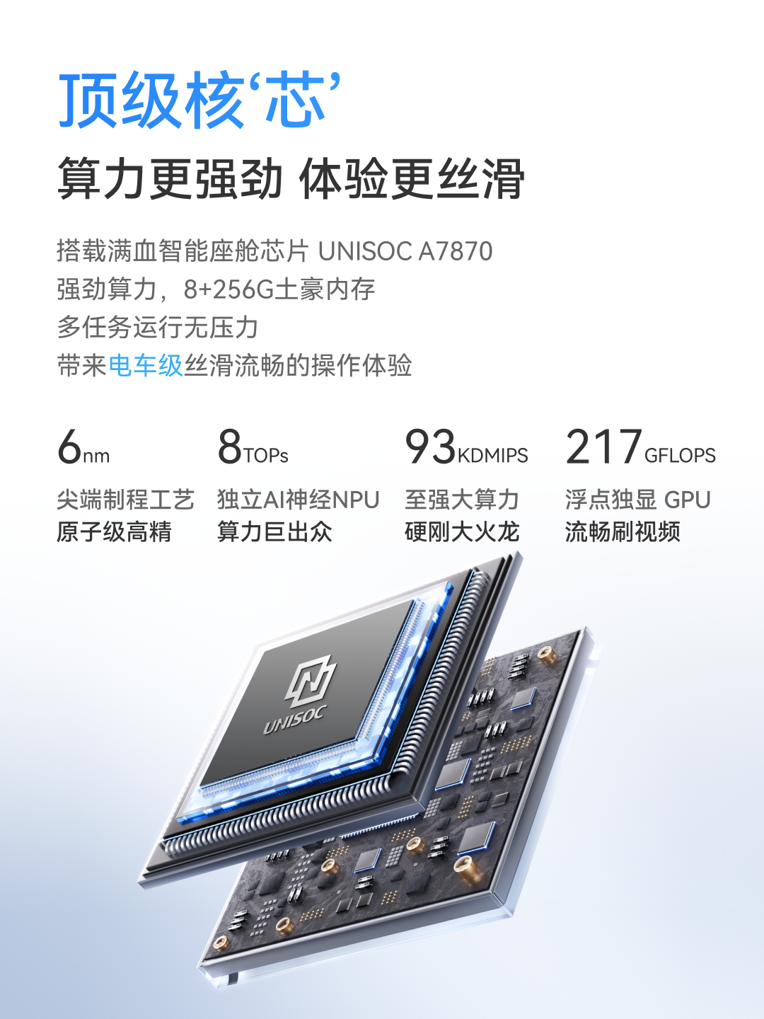 车机搭载紫光展锐7870顶级AI芯片,配合8+256G超大内存组合,提供强劲算力支持。芯片性能跑分超越部分新势力电车芯片,实现性能与功耗的完美平衡。无论是多任务处理(如导航、音乐播放、AI语音助手)还是运行大型应用,车机都能保持流畅不卡顿。即使长时间使用,也不会出现内存不足导致的操作延迟或应用闪退问题,彻底解决传统车机“卡顿、反应慢”的痛点,带来丝滑流畅的智能交互体验。