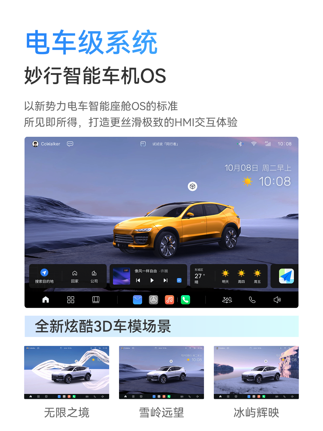 车机搭载独有的电车级OS系统,从界面设计、功能布局到交互体验均达到新势力电车的智能座舱标准。系统支持真·3D车模桌面,可自定义车身颜色、轮毂样式及天气场景,提供个性化体验;支持电车同款的三分屏/二分屏布局,实现导航与娱乐兼顾;采用极简HMI设计,操作逻辑清晰,即使是年长用户也能轻松上手,带来丝滑流畅的交互体验。