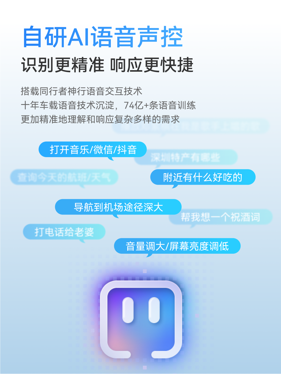 车机搭载超精准自研AI语音系统,支持导航、听歌、接打电话、空调控制等功能的语音操作。采用双数字麦克风降噪技术,有效过滤风噪和发动机噪音,高速行驶时仍能精准识别语音指令,确保双向通话清晰流畅,提升行车安全与便捷性。