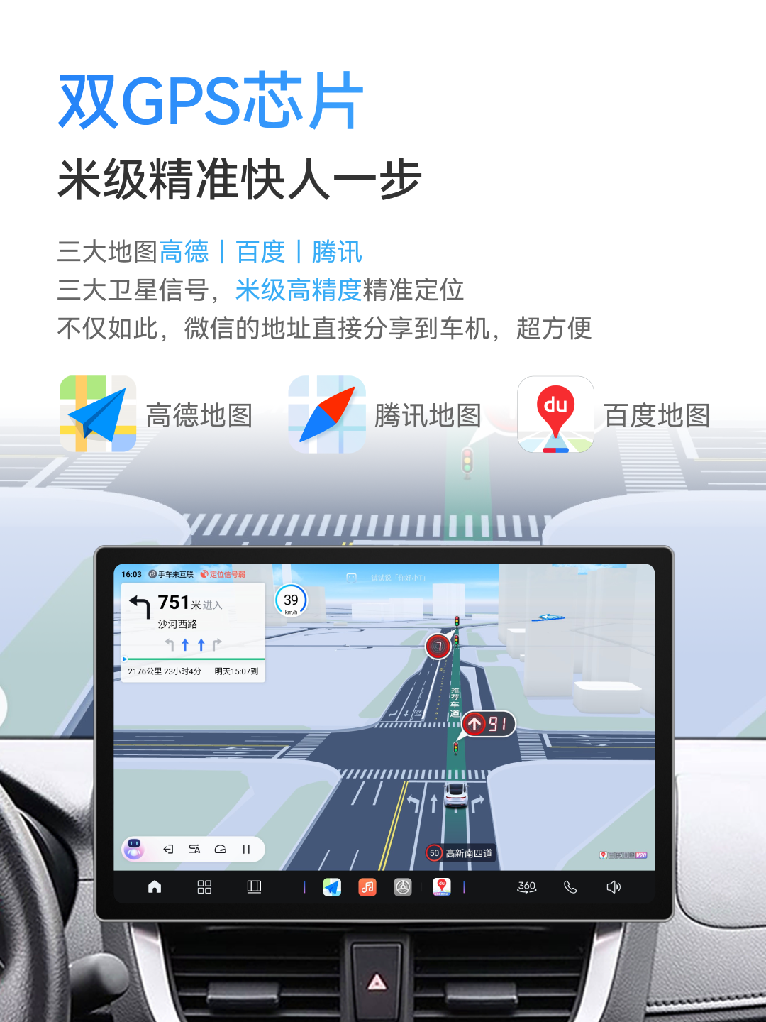 车机全面支持高德、百度、腾讯三大主流导航系统,用户可根据个人习惯自由选择,无需担心导航数据不全或路线规划不合理的问题。车机采用双芯片米级定位技术,定位精度远超传统车机,可精准识别车辆位置并同步红绿灯等待时长,实现车道级导航。无论城市道路还是高速公路,都能提供精准的导航指引,让出行更安心高效。