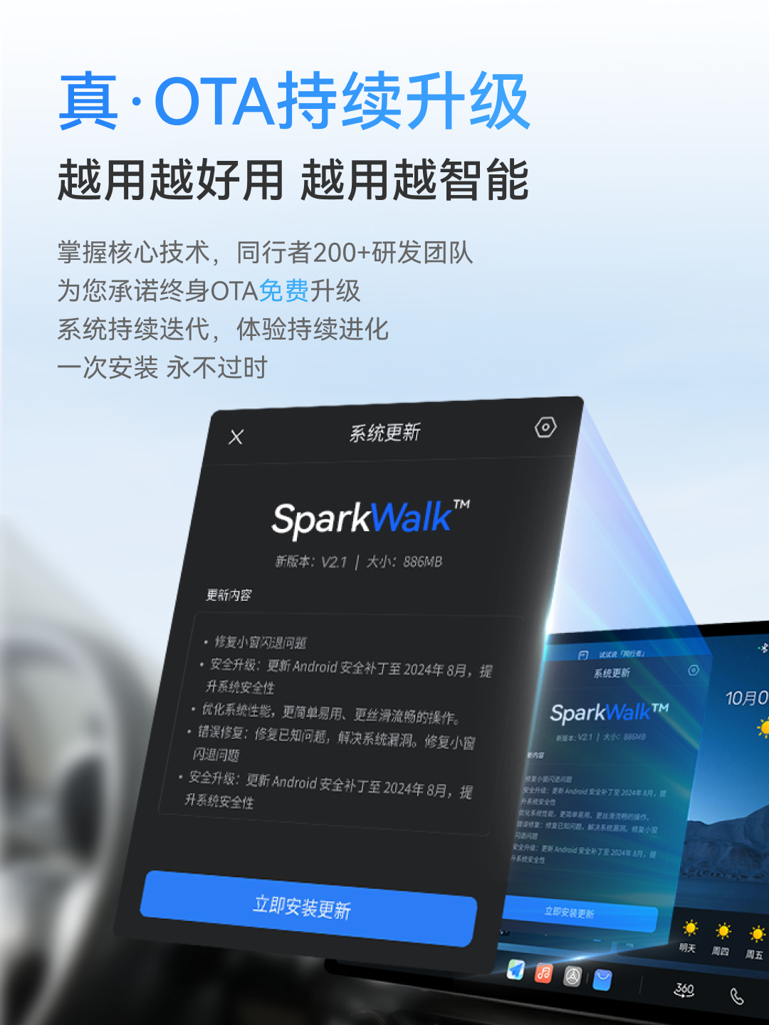 车机支持一键OTA升级,通过车机即可完成系统、功能和应用更新。同行者科技承诺终身免费升级服务,确保车机功能持续更新优化。200+研发工程师团队根据用户反馈和市场需求,对产品进行持续迭代,新增实用功能并提升用户体验,为车主提供长期智能服务保障。