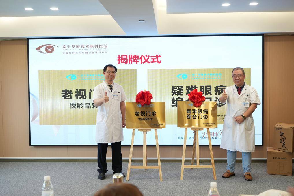 南宁华厦视光眼科医院副院长赵华平和眼底病专家宋昊刚携手登台,为我们揭牌老视门诊和疑难眼病综合门诊。这一仪式标志着医院在眼健康服务领域的进一步拓展!南宁华厦视光眼科医院将持续推进老视、疑难眼病服务升级,为广西区域老视人群提供更专业化、个性化的诊疗服务;为疑难眼病患者提供高效精准的眼病解决方案,助力实现清晰视界,提升品质生活。
