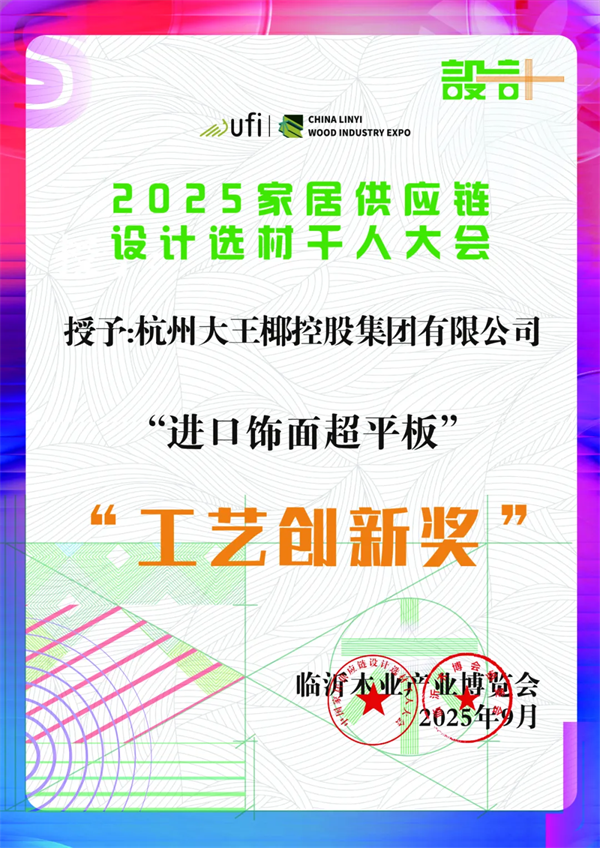 在同期举办的2025家居供应链设计选材千人大会上,这款引发饰面美学价值共鸣的新品,成功斩获了由组委会颁发的“工艺创新奖”;从美国Muse设计铂金奖、伦敦设计铂金奖等六项国际大奖加冕,到再夺业内“工艺创新奖”,大王椰旗舰系列上市的“开挂”之路,本质上是一场“美学&品质”升维的破卷突围战。