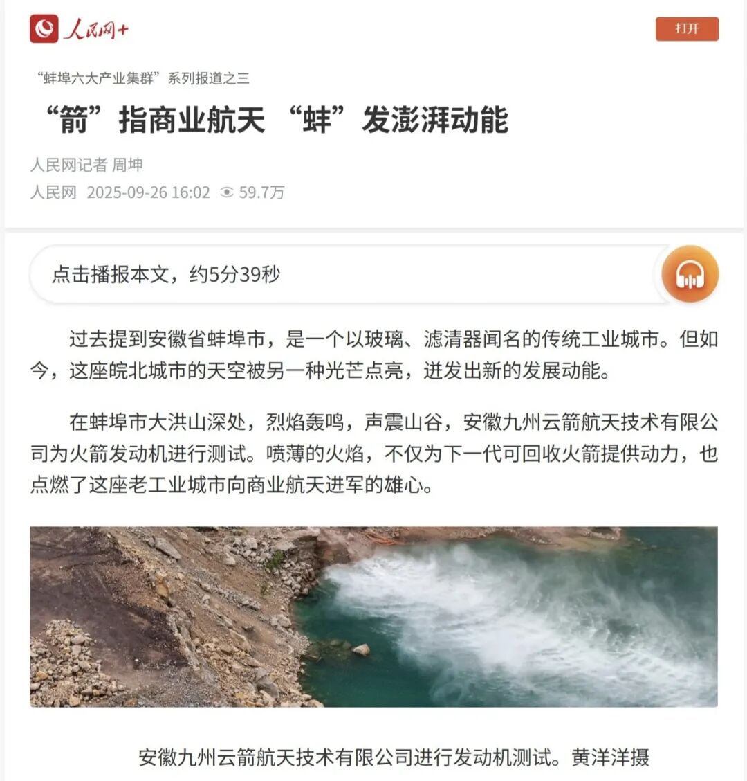 在蚌埠市大洪山深处,烈焰轰鸣,声震山谷,安徽九州云箭航天技术有限公司为火箭发动机进行测试。喷薄的火焰,不仅为下一代可回收火箭提供动力,也点燃了这座老工业城市向商业航天进军的雄心。