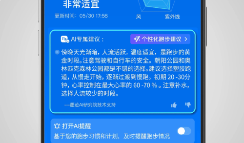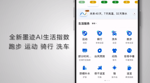 传统天气预报APP通常只提供温度、降水概率等基础信息,而用户真正需要的是“在这样的天气下,我该怎么做?”墨迹天气「AI·生活指数」正是瞄准这一痛点,通过AI算法分析多维气象数据,并结合用户需求,提供运动、骑行、跑步、洗车四大场景的精准建议。
