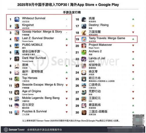 10月11日,Sensor Tower最新发布的9月中国手游出海收入榜显示,世纪华通专注海外市场的子公司Century Games旗下《Whiteout Survival》与《Kingshot》连续第三个月包揽冠亚军席位,另外《Tasty Travels: Merge Game》排名也提升4位至第19名。与此同时,在全球知名游戏媒体Pocket Gamer近日公布的《2025年全球TOP50移动游戏商》榜单中,Century Games从去年第7位跃居全球第一,创下该榜单晋升速度纪录。