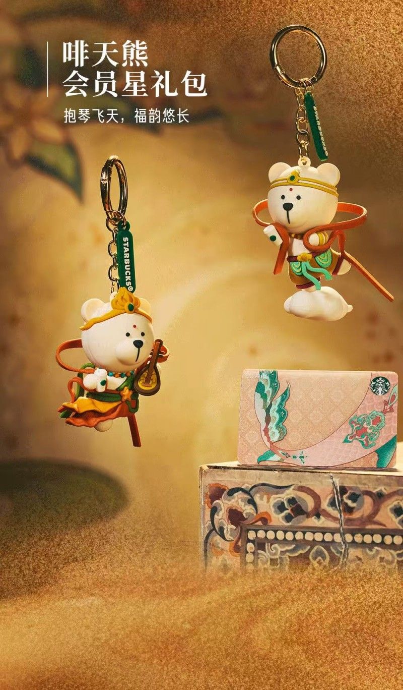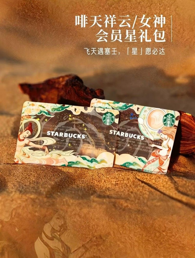 限定会员星礼包:星巴克经典形象“熊店长”化身为脚踏祥云、手持琵琶的“飞天”,设计可爱又吸睛。此外,礼包内还包含两张设计精巧的星礼卡,透卡叠加时可呈现出飞天与塞壬相会的透视效果,暗藏“穿越时空”的巧思。