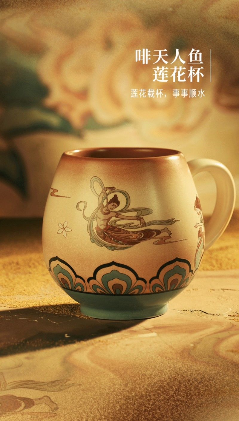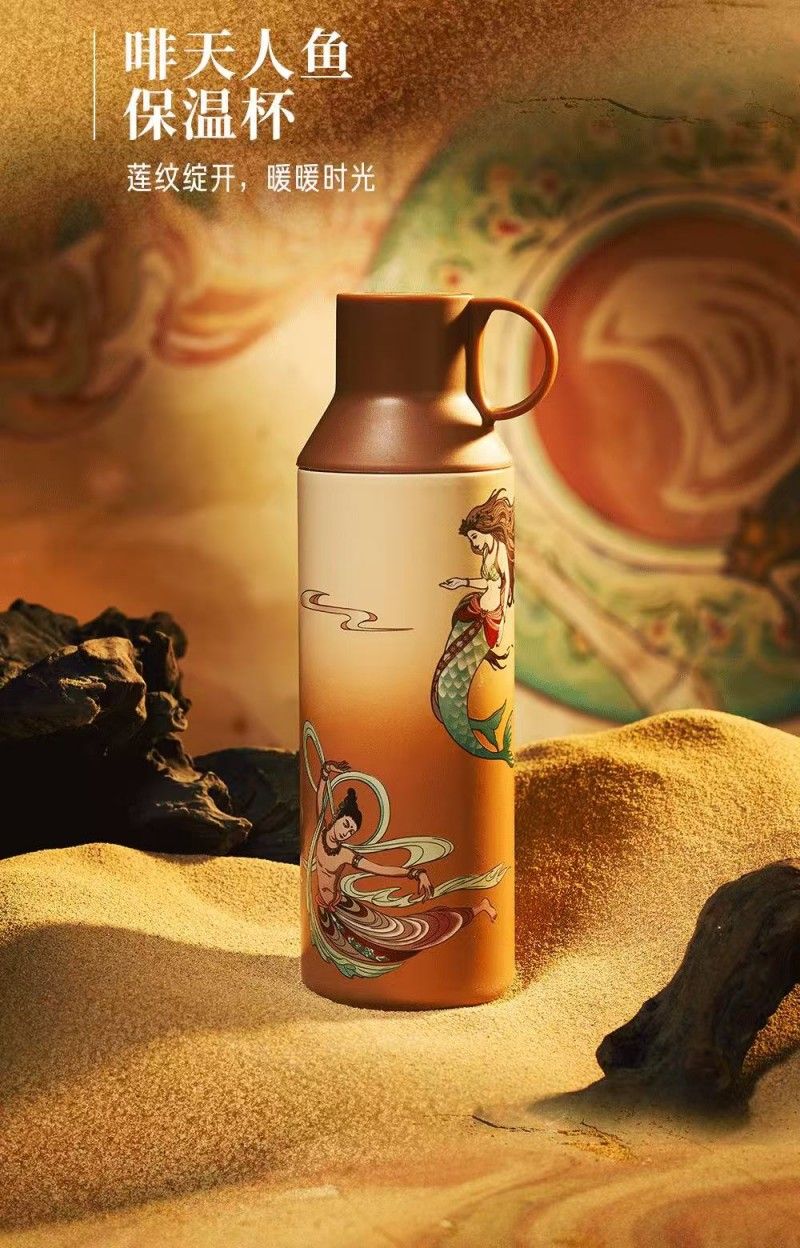 联名马克杯及保温杯:杯身设计展现了敦煌飞天与塞壬女神的邂逅场景,融合了飞天飘带、陀螺花与咖啡花等图案,整体采用敦煌壁画的复古色调,握在手中仿佛捧起一幅流动的壁画。